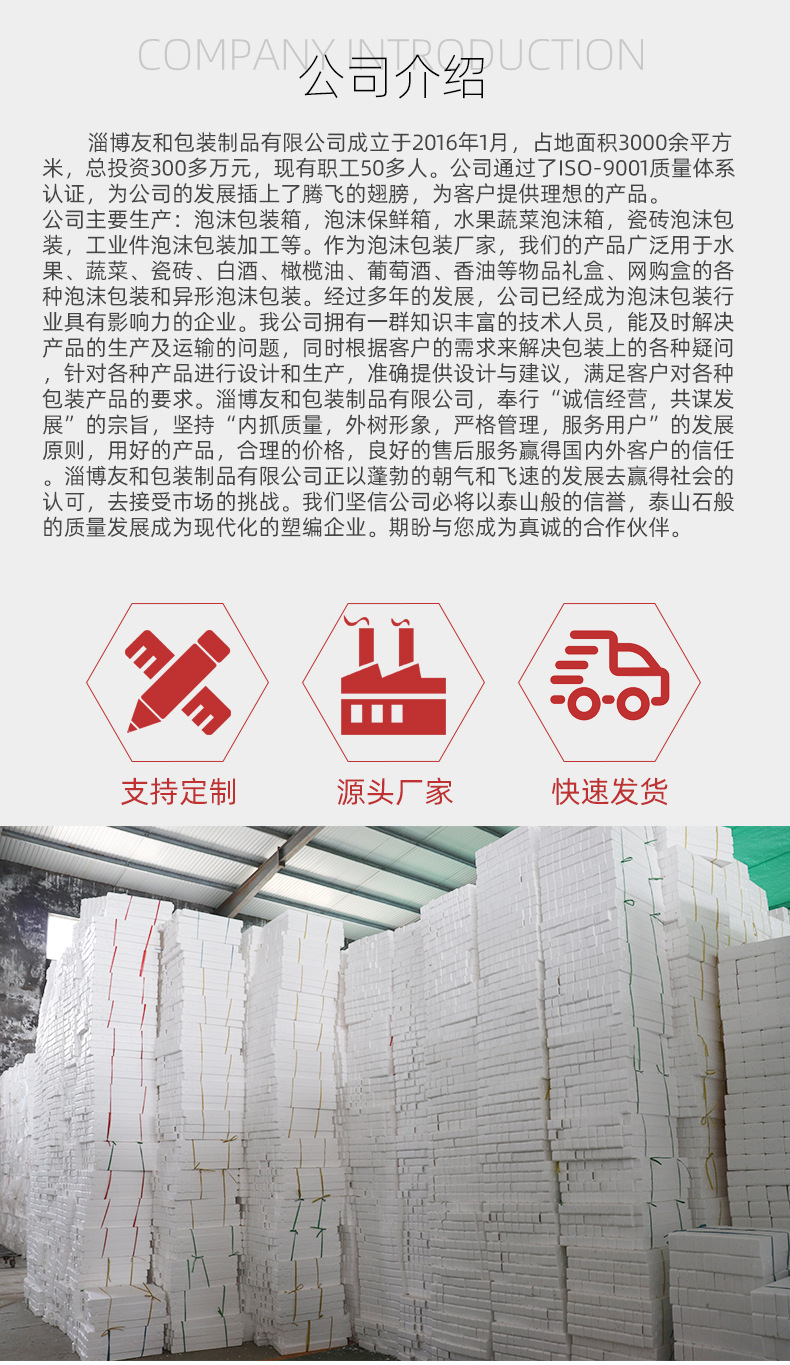 ????淄博友和包裝制品有限公司是專業(yè)的山東泡沫包裝箱加工廠家,本廠主要產(chǎn)品有:泡沫包裝箱,泡沫保鮮箱,水果蔬菜泡沫包裝箱,水果蔬菜泡沫保鮮箱,瓷磚泡沫包裝箱等,產(chǎn)品暢銷全國,深受用戶好評。泡沫包裝定做可以聯(lián)系我們網(wǎng)站 http://www.tdtnh.cn/ 上電話,我們會第一時間跟您聯(lián)系。